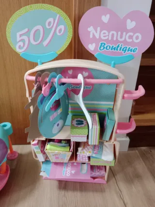 Set de juegos Nenuco que incluye una caja registradora y una boutique. - Caja registradora con accesorios. - Boutique con perchero y estantes. - Incluye carteles de 50% y Nenuco Boutique. Tiene muy poco uso. Lo q se ve en la foto