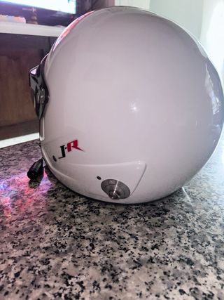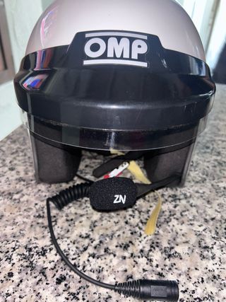 Casco de rally de la marca OMP, ideal para competiciones. - Diseño con visera. - Incluye micrófono con cable en espiral. - Conector de audio.