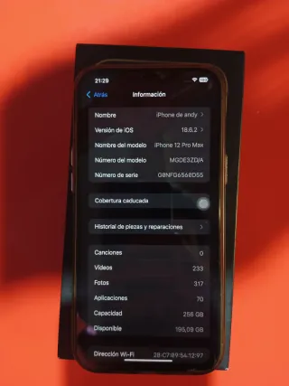 iPhone 12 Pro Max con 256 GB de capacidad. - Modelo: iPhone 12 Pro Max - Capacidad: 256 GB - Número de modelo: MGDE3ZD/A - Número de serie: G0NFG6560D55
