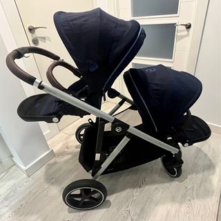 Cochecito Cybex Gazelle S Duo en color azul marino. El conjunto consta de dos sillas, capazo y cesta. Una las sillas está nueva a estrenar y la otra utilizada en contadas ocasiones. El capazo, ha tenido un uso moderado durante 4 meses. Chasis, ruedas, telas y piel en perfecto estado. Contactar para más fotos y/o información.