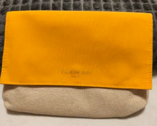 Neceser de la marca Guerlain. - Diseño bicolor en amarillo y beige. - Tamaño compacto, ideal para llevar lo esencial.