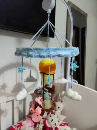 Móvil de cuna hecho a mano con la técnica amigurumi. Ideal como regalo para recién nacidos. - Diseño de globo aerostático con nubes y estrellas. PEDIDOS A MEDIDA; - Incluye figuras de animales. - Colores suaves y alegres. - Sonajeros, juguetes sensoriales bebé - Regalos a medida, cumpleaños, bebés.. Consultar para pedidos y temática, precio a según pedido. Precio foto móvil cuna 75€ completo, gira con sonido de nana. Precio solo móvil, resto de fotos son ejemplos visuales.