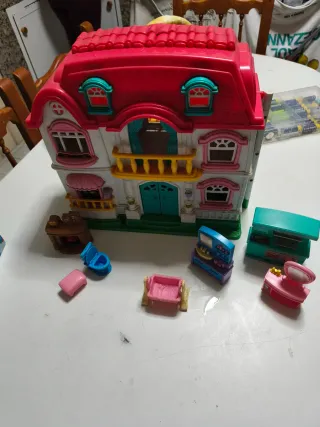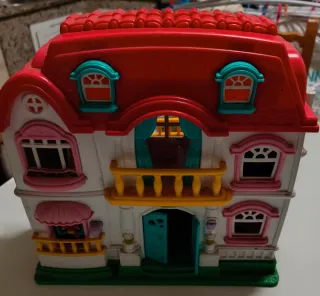 Casa de muñecas de la marca Happy Family, con un diseño colorido y divertido. - Techo rojo con tejas. - Ventanas con marcos de colores. - Balcón amarillo. - Puerta azul que se abre. Loro en la ventana se mueve. - La casa se abre por un lateral y queda en dos partes con dos pisos y desván. - Tiene diferentes accesorios.