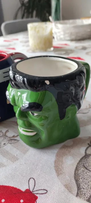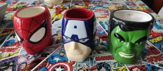 Set de tres tazas con diseños de personajes de Marvel. - Taza con diseño de Spiderman. - Taza con diseño de Capitán América. - Taza con diseño de Hulk. Consultar venta por unidad! Capitán América tiene la asa pegada, y algún que otro astillazo.