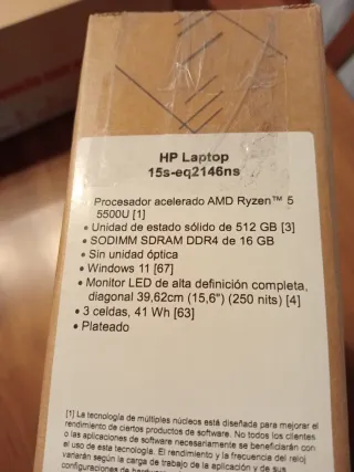 Portátil HP 15s-eq2146ns con pantalla de 15.6 pulgadas. - Procesador AMD Ryzen 5 5500U. - Memoria RAM de 16GB. - Almacenamiento SSD de 512GB.