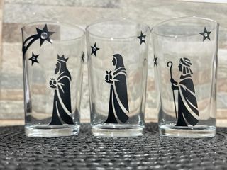 Conjunto de tres vasos de cristal con diseño de los Reyes Magos y estrellas. - Figuras de los Reyes Magos en silueta negra. - Detalles de estrellas y cometa. - Diseño festivo para Navidad.
