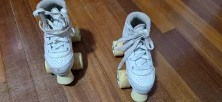 Se venden patines Oxelo en talla 30. Son de color blanco con detalles iridiscentes. - Diseño alto tipo bota. - Cierre con cordones.