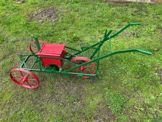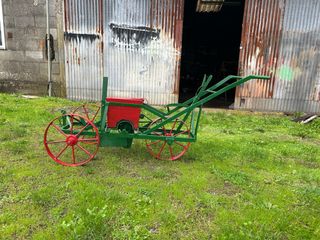 Esta pieza decorativa es una réplica de una sembradora antigua, ideal para añadir un toque rústico a tu jardín o patio. - Estructura metálica pintada en verde. - Caja de siembra en color rojo. - Ruedas con detalles en rojo.