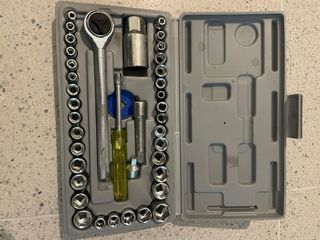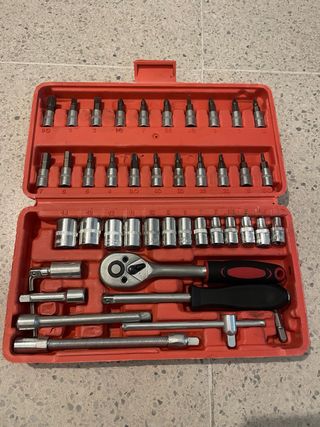Maletín de herramientas con 46 piezas, ideal para reparaciones y mantenimiento. - Incluye carraca y diversos vasos y puntas. - Estuche organizador de plástico rojo. -solo tiene un vaso de torch roto.