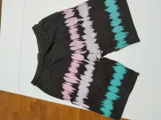 Pantalones cortos con un diseño tie-dye vibrante y moderno. Perfectos para un look casual y llamativo. - Cintura elástica con cordón ajustable. - Estampado de rayas en tonos rosa, lila y turquesa. - Tejido suave y cómodo.