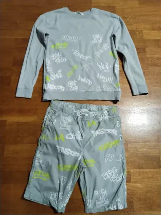 Conjunto de sudadera y pantalón corto para niñ@ con estampado de graffiti. - Sudadera gris con manga larga. - Pantalón corto gris con cordón. - Diseño con texto y grafitis en blanco y verde lima.