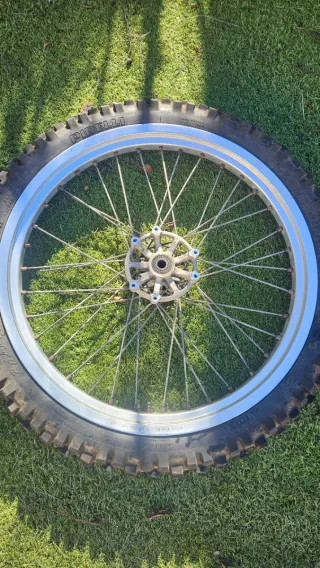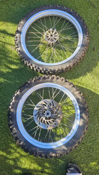 Juego de dos ruedas de cross para Derbi con acabado cromado. - Llantas cromadas. - Corona de 52 dientes. - Sin disco delantero - Neumáticos de cross al 60%. - La de delante tiene 2 radios mal y la trasera 1 Compatibles con: Aprilia sx/rx, Derbi senda, derbi terra, malaguti, UM dsr, ksr
