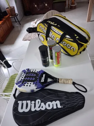 Conjunto de pádel que incluye una mochila y una pala. También puedo vender separadas la pala o la mochila. 25 euros la pala y 20 la mochila.Juntos 40 euros. - Mochila de pádel Wilson. - Pala de pádel Wilson Force. - Incluye funda para la pala. Venta personalmente.