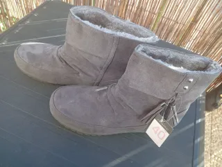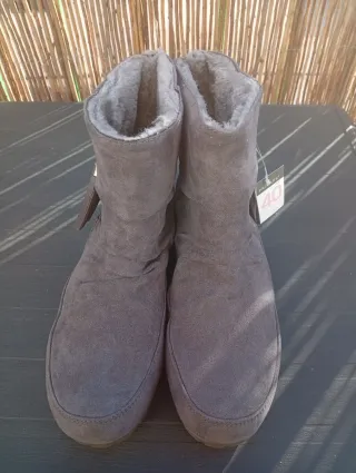 Botines nuevos de ante en color gris. El interior está forrado de pelo sintético para mayor comodidad. -Detalle de etiqueta con talla.