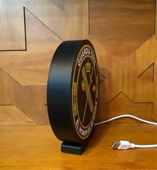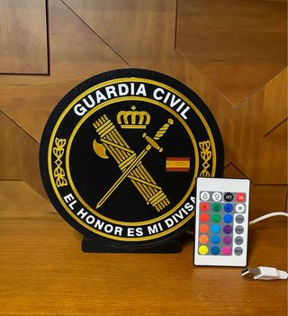 Lámpara decorativa con el emblema de la Guardia Civil. Incluye mando a distancia para cambiar el color. - Diseño circular con escudo. - Texto Guardia Civil y El honor es mi divisa. - Mando a distancia con múltiples colores y modos (flash, strobe, fade, smooth). - Fabricada en plastico