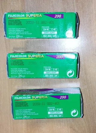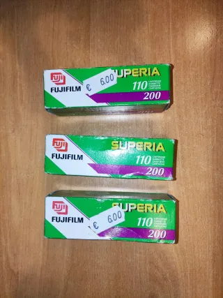 Tres paquetes de película Fujifilm Superia 110. - Formato 110. - ISO 200. - Dos Caducados en 2009 y otro en 2006. Son la joya de la corona. - Ideales para lomografia y fotografía experimental. - 24 exposiciones. - No conservados en nevera