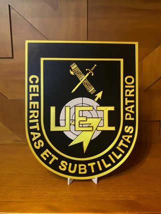 Insignia de la Unidad Especial de Intervención (UEI) de la Guardia Civil. - Diseño en relieve con detalles dorados. - Fondo negro con emblemas. - Texto CELERITAS ET SUBTILITAS PATRIO en el borde. -Fabricada en plastico -Descuentos por comprar 5 artículos o mas