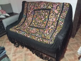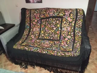 Precioso mantón de Manila con bordados florales y de aves. En perfecto estado, bien conservado, medidas 160x160cm, más 10cm de ganchillo y 40cm de flecos - Base negra. - Amplio y detallado bordado multicolor. - Flecos negros.