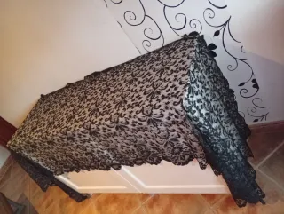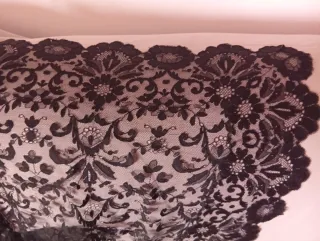 Elegante mantilla antigua de encaje negro, con un diseño floral intrincado y un borde festoneado. Medidas 250x80cm - Material: Encaje. - Color: Negro. - Diseño: Floral. - Borde: Festoneado.