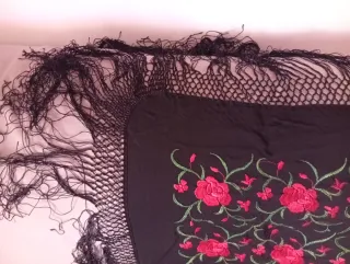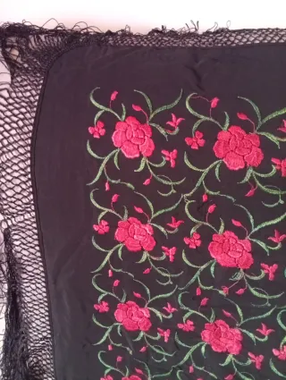 Precioso mantón de Manila antiguo con un delicado bordado floral. Muy bien conservado Medidas 80x80cm, más 5cm de ganchillo y 20cm de flecos - Color negro. - Diseño de flores rojas y hojas verdes. - Flecos largos y abundantes.