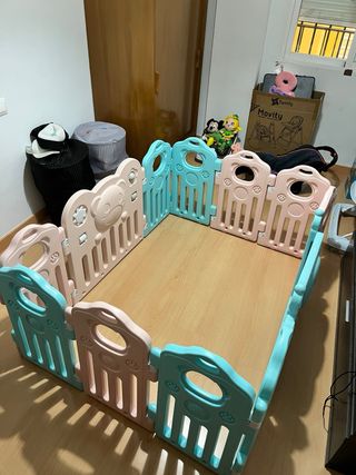 Corralito para bebé en tonos pastel y azul. - Paneles de plástico resistentes. - Diseño con huellas de patitas. - Fácil de montar y desmontar.