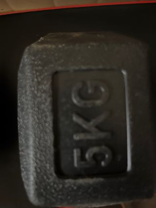 Mancuerna individual de 5 kg, ideal para entrenamientos en casa. - Peso: 5 kg. - Material: Hierro fundido recubierto. - Diseño hexagonal para evitar que ruede. 18€ las dos