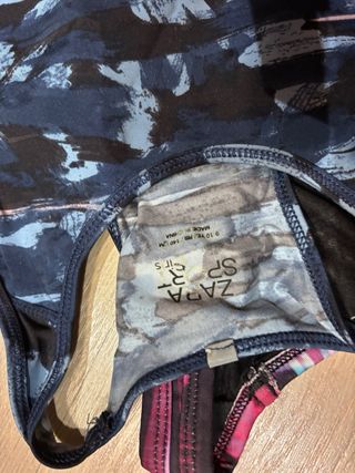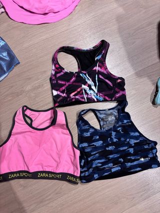 Tres tops deportivos de la marca Zara, ideales para actividades deportivas. 8 euros los tres - Top con estampado geométrico en tonos fucsia y negro. - Top liso en color rosa con detalles de malla. - Top con estampado de camuflaje en azul marino y claro.