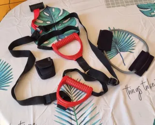 Equipo de entrenamiento TRX con accesorios. - Incluye asas rojas para ejercicios. - Incorpora una goma de tensión. - Dispone de enganche para puerta. -Se encuentran en pajara pueblo fuerteventura. -Posibilidad transporte gratis preguntar . PRECIO 29€ todos junto.