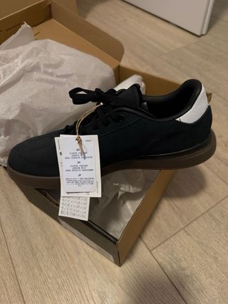 Zapatillas Adidas Spezial en blanco y negro, con detalles en ante beige y suela de goma marrón. - Diseño clásico de Adidas. - Detalle lateral Spezial en dorado. - Tres rayas características de la marca en negro. - Cierre de cordones. - Logo de Adidas en la lengüeta y el talón.