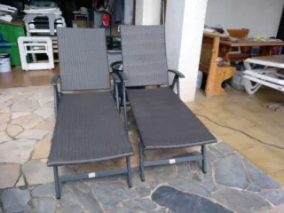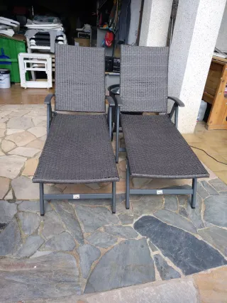 Conjunto de dos tumbonas reclinables, perfectas para disfrutar del exterior. En buenas condiciones gris reclinables - Estructura de metal. - Revestimiento de ratán. - Color gris.