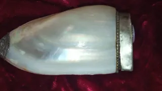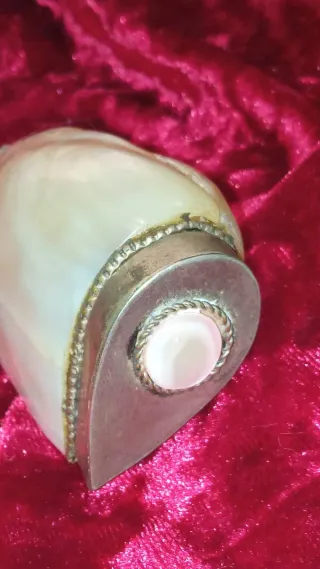 Antiguo bote decorativo elaborado con concha de nácar y detalles en plata. - Concha de nácar iridiscente. - Montura y remates en plata. - Diseño único y elegante.