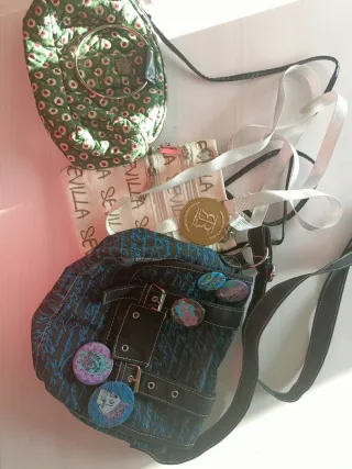 Se venden juntos o por separado (el precio incluye los tres) Conjunto de tres bolsos con diferentes diseños y tamaños. - Bolso verde acolchado con aro metálico. - Bolso de tela con estampado Sevilla. - Bolso negro con detalles en azul y adornos. - Incluye varios pines decorativos.