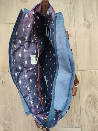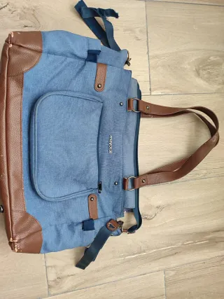 Bolso de la marca Mayoral, ideal para llevar todo lo necesario. - Color azul vaquero. - Detalles en polipiel marrón. - Bolsillo frontal. Desgastado la parte marrón