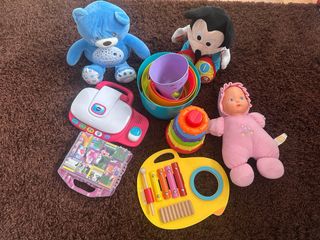 Conjunto de juguetes para bebés y niños pequeños. - Peluche de oso azul. - Muñeca de bebé con traje rosa. - Xilófono de colores con baquetas. - Juego de vasos apilables. - Juguete interactivo VTech. - Mickey Mouse de peluche.