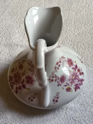 Jofaina de porcelana con acabado brillante y un bonito diseño floral detallado en tonos rosa, violeta y blanco. Medidas: 22 alto x 25 ancho Formato: Decantador Ideal para añadir un toque decorativo a tu baño o aseo. Perfecto estado. Carece de uso por estar guardado en vitrina. Bastante pesado y base redonda con firme apoyo. No sucio, no roto, no mellado. Hago envíos.
