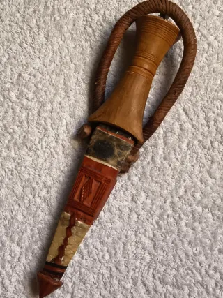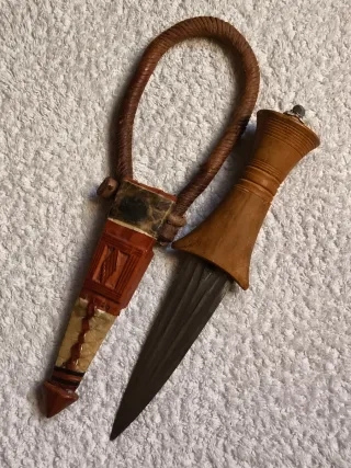 Daga Tebu de Nigeria para brazo. Procede de Norte de África y muy decorativa para colección con influencias de ese continente Medidas: 26 cm con funda Hoja acero: 11,50 cm Empuñadura de madera Funda de cuero y piel con detalles tallados. Muy bien conservada por coleccista privado. Hago envíos.