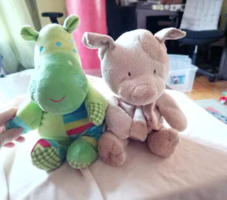 Dos peluches muy suaves y blanditos, perfectos para abrazar, para bebes, etc. - Peluche verde con diseño de hipopótamo. - Peluche beige con diseño de perro. - Materiales de felpa suave, blandos y achuchables. Los 2 por 7 € Uno 4 €