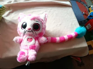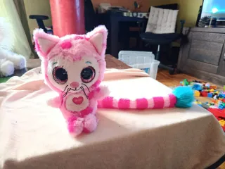 Adorable peluche de gatito en color rosa con detalles a juego. Su cola a rayas añade un toque divertido. El peluche está perfecto, pero maullaba y al segundo día iba mal. Podrían ser las pilas pero no se descose. El diseño es muy bonito. - Diseño de gatito. - Color rosa y blanco. - Cola a rayas con pompón azul.