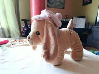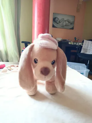 Adorable peluche con forma de perro, de color rosa y con un gorrito a juego. - Suave al tacto. - Orejas largas y caídas. - Ojos brillantes y nariz marrón.