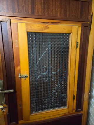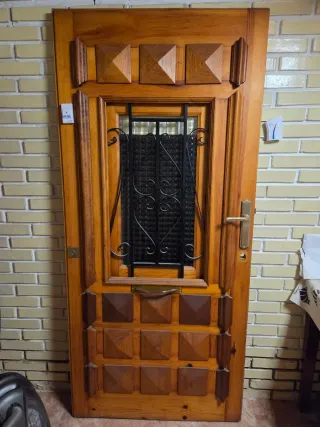 Puerta de madera maciza con un diseño rústico y robusto. - Medidas aproximadas: 1,89 metros de alto por 0,865 metros de ancho. - Fabricada en madera maciza, lo que garantiza durabilidad y un acabado natural. - Presenta detalles tallados en la parte superior e inferior, aportando un toque decorativo. - Incluye una reja ornamental en la parte superior, que se puede abrir como que fuese una ventana sin perder seguridad. Recoger en Frómista