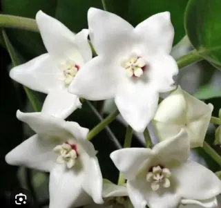 Planta Hoya Magnifica con flores blancas. - Flores en forma de estrella. - Pétalos blancos con centro rojizo. - Hojas verdes.
