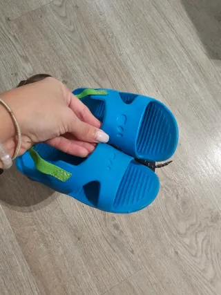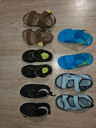 Lote de zapatos para niños, incluye sandalias y zapatillas. - Sandalias marrones con velcro. - Sandalias azules tipo pala. - Zapatillas negras con cordones. - Sandalias azules con estampado de peces.
