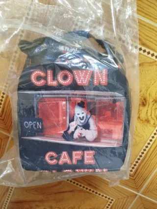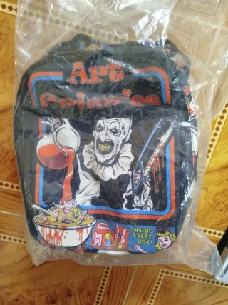 Lonchera con estampado de Art the Clown, inspirado en Art's Crispies. - Diseño temático de terror. - Cierre de cremallera. - Incluye un pequeño bolsillo frontal.