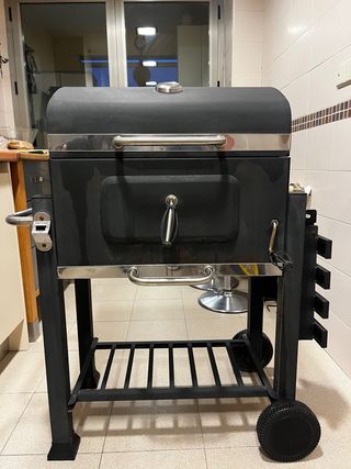 Barbacoa de carbón con un diseño robusto y funcional. - Acabado principal en color negro. - Detalles en acabado plateado. - Estructura de metal resistente. - Ruedas para facilitar su movilidad.