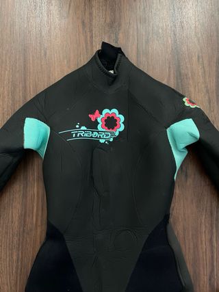 Neopreno completo para mujer, ideal para deportes acuáticos. Usado un viaje - Diseño en color negro con detalles en gris y turquesa. - Rodilleras reforzadas. - Cierre de cremallera en la espalda.