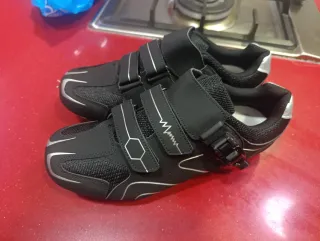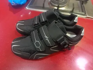 Zapatillas de ciclismo en color negro con detalles plateados. - Cierre de velcro y hebilla. - Diseño deportivo. - Material transpirable.