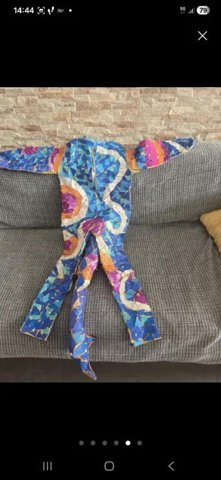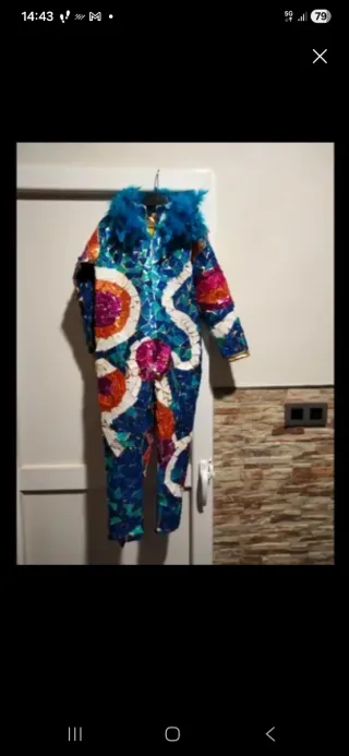 Disfraz inspirado en el estilo de Antoni Gaudí, con un diseño vibrante y colorido. - Diseño tipo mono completo. - Adornado con plumas azules en el cuello. - Motivos circulares y ondulados en tonos azules, naranjas, rosas y blancos. - Detalles brillantes y texturizados.