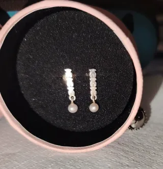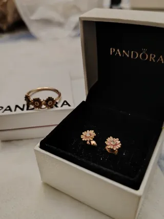 Precioso conjunto de joyería Pandora. - Diseño de flores con esmalte rosa. - Detalles en tono dorado. Apenas utilizado en 3 o 4 ocasiones el anillo es talla 60, original. Tengo factura y el anillo costó 89 euros. Los pendientes 59.