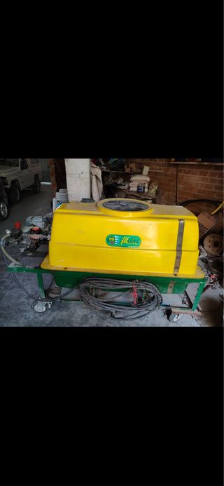 Cuba fitosanitaria de color amarillo, ideal para tratamientos agrícolas. - Depósito - Estructura robusta con ruedas. - Mangueras y conexiones incluidas.