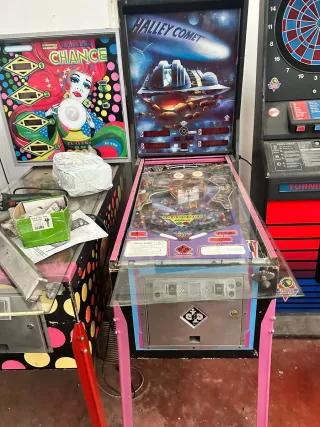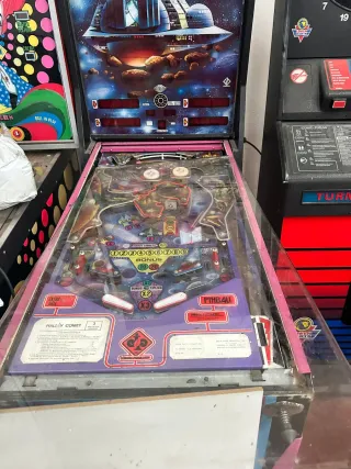 Máquina de pinball temática del espacio exterior. - Modelo Halley Comet. - Diseño con temática de cometas y naves espaciales. - Panel de juego con luces y marcadores.